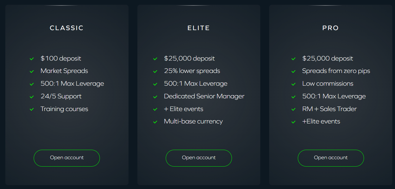 ADSS offers clients a choice of three account types: Classic, Elite, and Pro. Let’s start with the most accessible option — Classic. The minimum deposit is $100, which is a standard entry point for most beginners. This account features market spreads and leverage of up to 1:500. Commissions are not specified, but based on the phrase “market spreads”, it’s clear the broker earns from the difference between buy and sell prices. Support is available 24/5. Training is also promised, though the details are vague — the site simply mentions “training courses”. Essentially, this is a basic starter account with no significant perks.