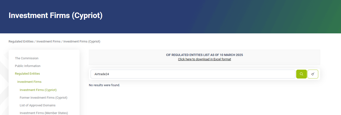 The legal side of AITrade24.com is a story of its own, and it looks not just suspicious but blatantly fraudulent. The broker confidently claims to operate “under CySEC regulation” and in compliance with Cypriot law. However, a check of the official CySEC registry revealed that no such organization exists and never has. There’s no license, no registration number, and no certificate.