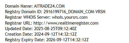 As for the company’s operational history, there’s no founding date or mention of its background anywhere. What we do know is that the domain aitrade24.com was registered on September 12, 2024, with the last update on August 25, 2025. This means the project has existed for about a year or less but tries to present itself as an experienced broker adhering to “global standards”. In reality, it’s just another hastily assembled platform created solely to collect deposits.