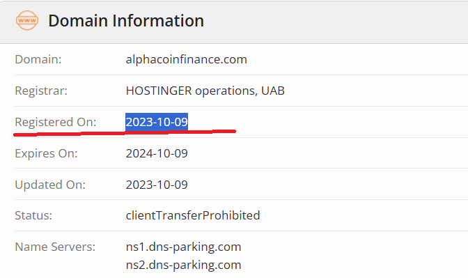 The current domain alphacoinfinance.com was registered on October 9, 2023, but was reserved until June 5, the date of the company’s rebranding. Before that, the company used the domain alphacoininvestment.com, registered on January 20, 2021. However, it was on sale by the registrar for quite a while and only started actively working in the second half of 2023. At the end of 2023 – early 2024, it was set up with redirects to mirror sites. Apparently, after being blacklisted by financial regulators, the site was blocked, and the owners had to think about client access.