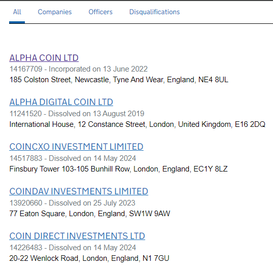 As we can see, a search in Companies House does not give an exact match for the name. The same result came from checking the former company name, Alpha Coin Investment. The closest name (first in the search results) belongs to a firm that missed the confirmation deadline and will be removed from the register.