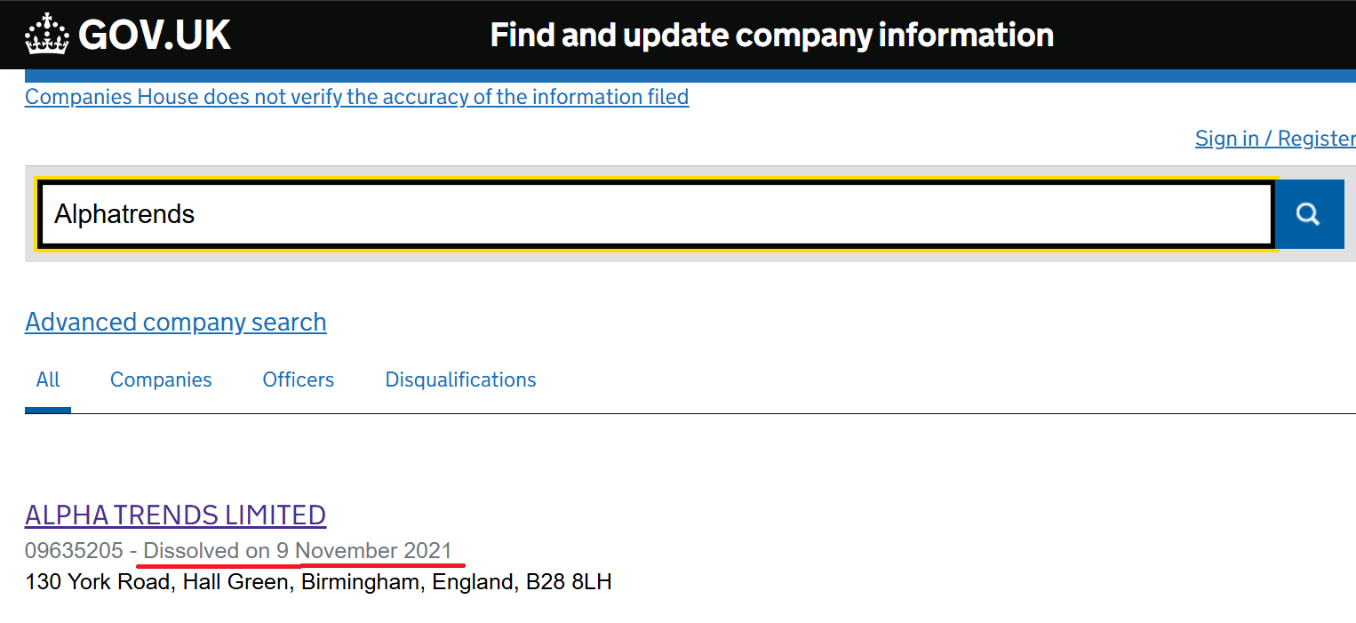And once again, it turns out that the only company with a name similar to our broker’s (although there are significant differences, ALPHA TRENDS LIMITED is certainly not the same as Alphatrends) is registered in Birmingham and ceased to exist in 2021. This means the broker has no registration information.