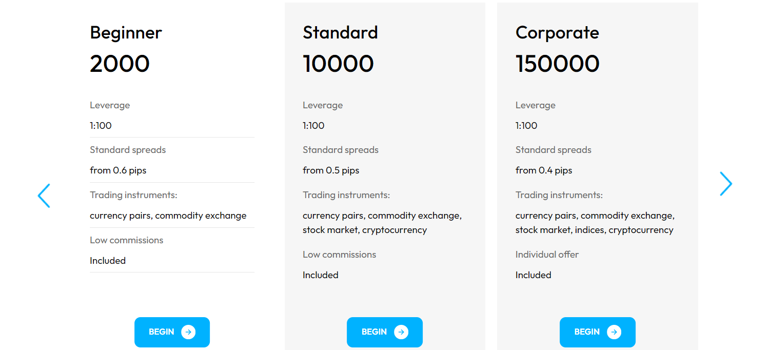 The broker has also included some data in the account types table. Here, you can find the minimum deposit amount, spread sizes, and a list of available assets. The company offers five plans in total: