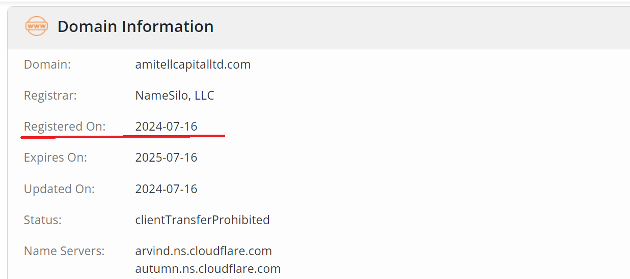 Further confirmation can be found through the whois service, which shows that the domain amitellcapitalltd.com was only registered on July 16, 2024.