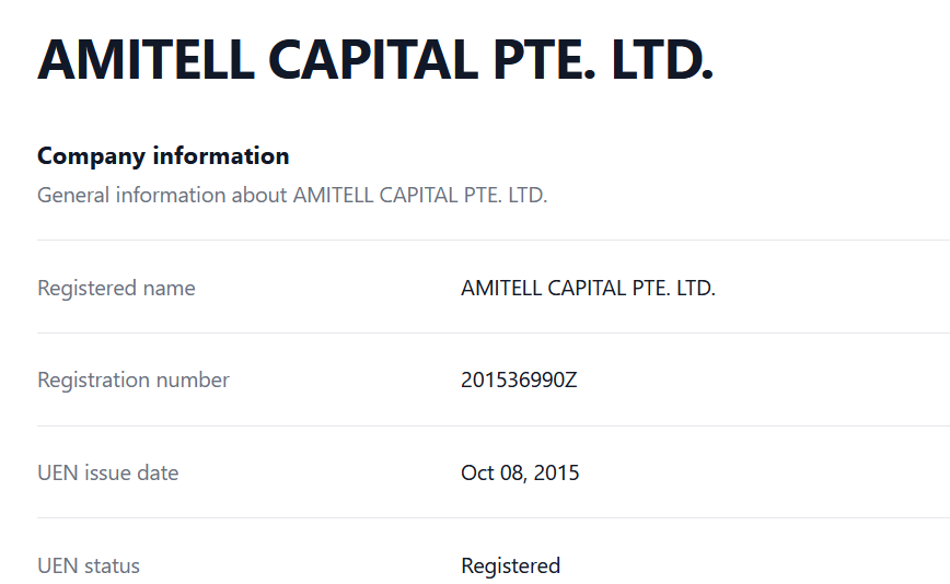Indeed, the registration information is accurate: a company named Amitell Capital PTE LTD was established in 2015 and is still active. Moreover, it even holds a license from the local financial regulator, the MAS (Monetary Authority of Singapore), authorizing it to operate in the stock market, specifically in fund management.