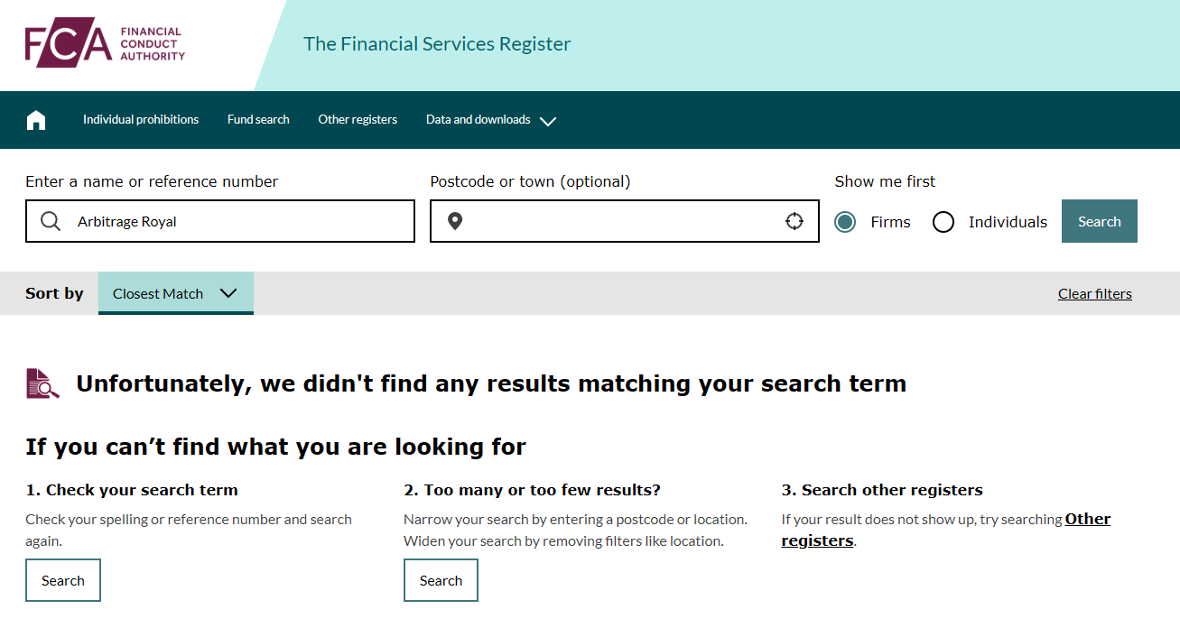 Let us start with licenses. Arbitrage Royal claims regulation by reputable authorities — the FCA in the UK, the CSSF in Luxembourg, and even boasts of being listed on the London Stock Exchange. The website lists fancy names like Arbitrage Royal PLC, Arbitrage Royal Fund Partners LLP, and Arbitrage Royal International Luxembourg S.A. Yet behind these words, there is nothing. In the FCA and CSSF registries, as well as on the LSE website, such organizations simply do not exist.
