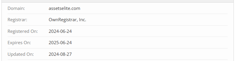 The company also claims to have been “in the market for 15 years” and to “serve millions of clients.” However, just check their domain registration, and the truth comes out. The site assetselite.com was registered only recently — in the summer of 2024. This is a clear indicator of a scam. Why? Because fraudsters quickly launch websites to collect as much money as possible and then vanish.