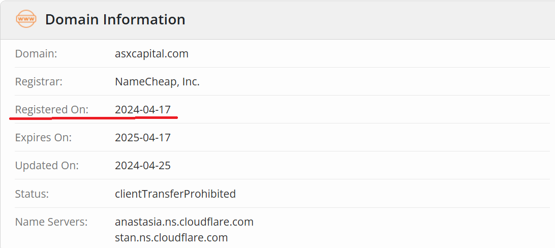 According to WHOIS data, the domain asxcapital.com was registered only in April 2024. This provides further evidence against the statistics the broker publishes on its homepage. While it claims 18 years of industry experience and over 40 awards at international events, the platform has been active for barely six months. Clearly, it is impossible to participate in, let alone win, 40 industry events in such a short time frame.