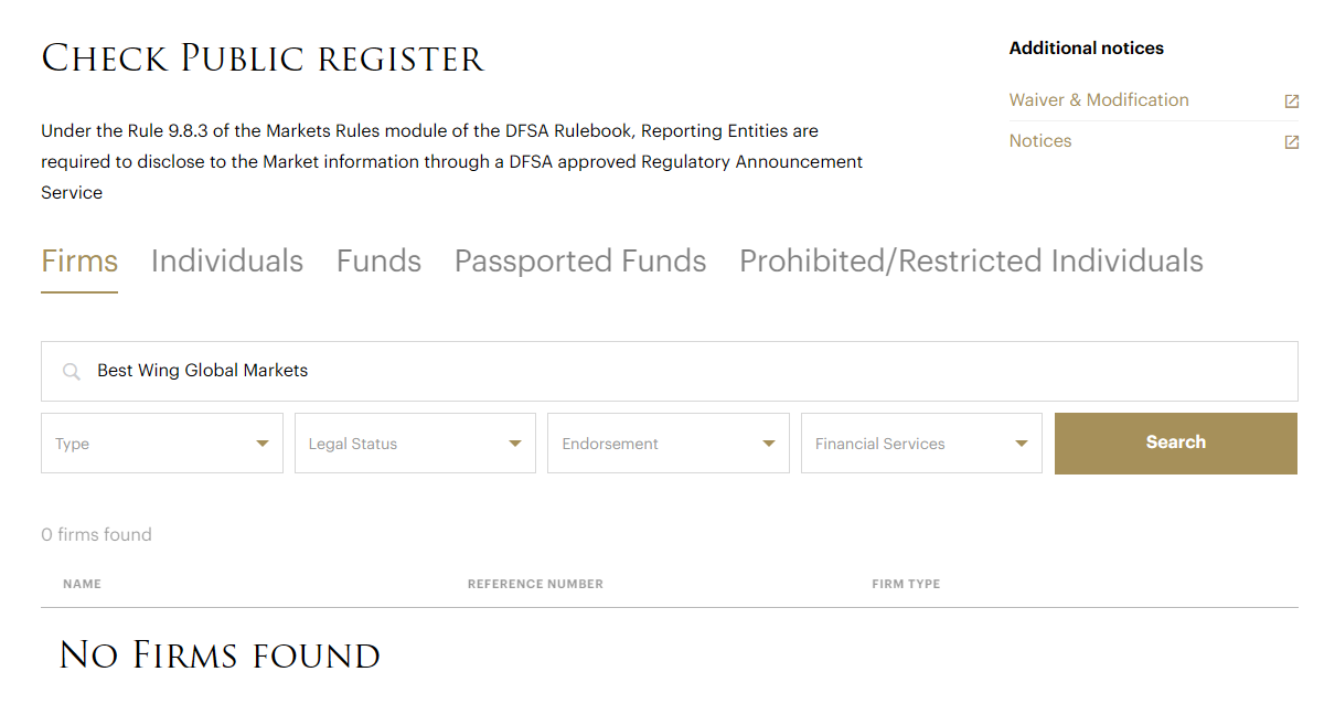 The DFSA is Dubai’s official financial regulator overseeing all market participants, including brokers, banks, and investment funds. A search in the DFSA’s official registry yields zero results. There is no such broker as Best Wing Global Markets Ltd, under this name or any other.