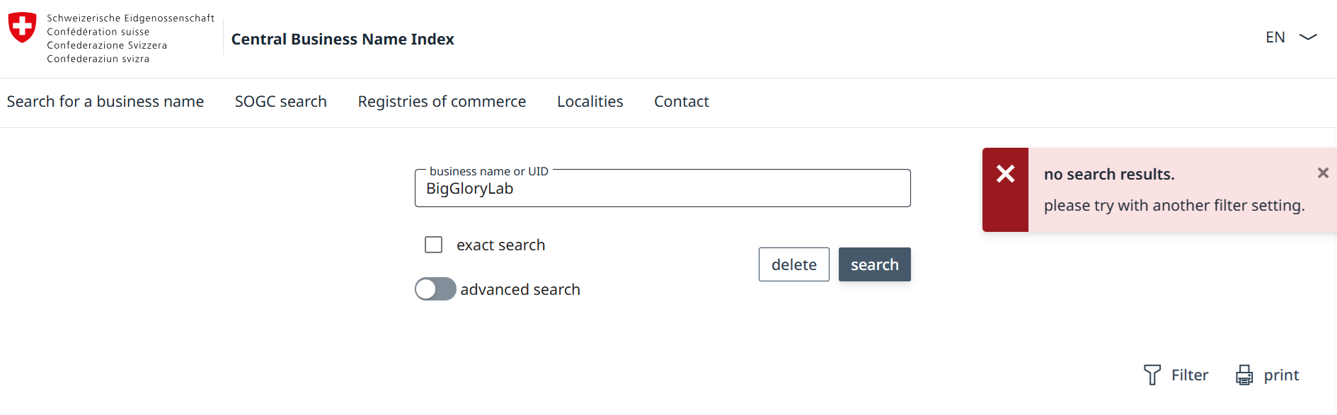 We also verified the registration status and found that the company is not legally registered at all. In other words, this is simply an anonymous website presenting itself as a Swiss broker. This explains why no offices exist at the claimed address. It is just a randomly chosen location, and there are no traces of BigGloryLab there.