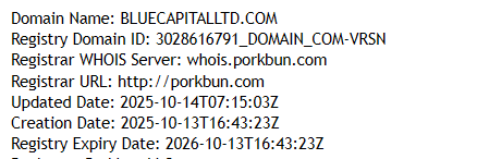 The firm raises doubts from the very start. Even without considering its dubious trading conditions and fake contact details, the legal background speaks volumes. The website claims the company is regulated, but the facts tell a different story. The domain bluecapitalltd.com was registered on October 13, 2025 — less than a month ago. This means all claims about “years of experience”, “tens of thousands of clients worldwide”, and “stable performance” are blatant lies intended to impress and deceive inexperienced traders.
