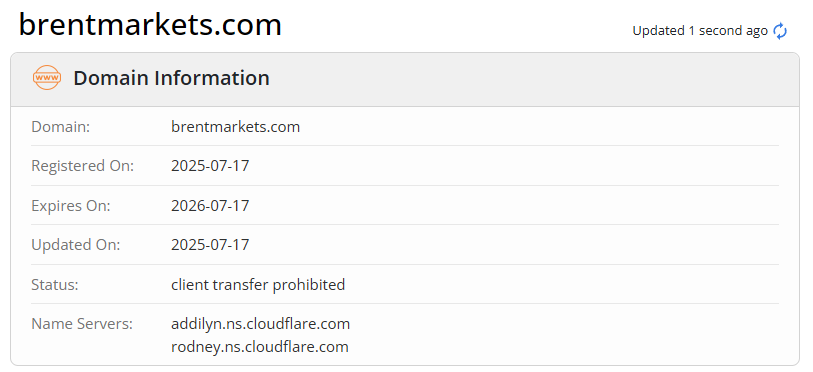 The project’s lifespan also deserves special attention. A domain check shows that brentmarkets.com was registered on July 17, 2025. In other words, the company is not even one year old. For brokerage activity, this is a critically short period, especially given the absence of licenses, history, reputation, and a transparent business model. This is a typical newly created project with no track record.