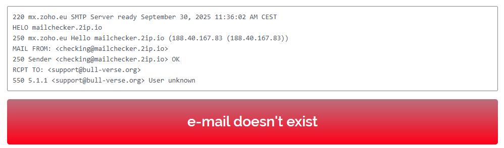 To contact the company, they list an email and three phone numbers. However, we checked this data and found it was fake. Bullverse provides a fraudulent email address that does not exist.