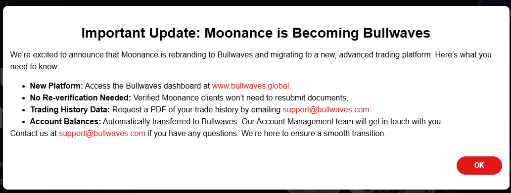 The legal entity Moonance had its own website, moonance.com, but when opening it, a warning appears stating that the platform has moved to the domain bullwaves.com. Why such changes? It is possible that the old brand became known for fraudulent activities, and now the company is forced to rebrand while retaining the old legal entities. We do not know the full truth, but such a transition looks highly suspicious.