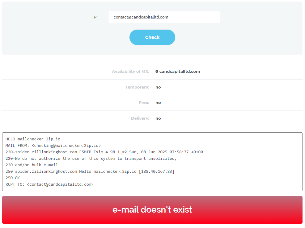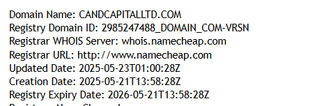 Another piece of evidence confirming the fake nature is the age of the company. The domain candcapitalltd.com was registered on 21 May 2025. This is confirmed by public WHOIS data. In other words, at the time of writing this review, the website was less than a month old. Meanwhile, the British company was officially registered in 2017. The gap between their launches is eight years.
