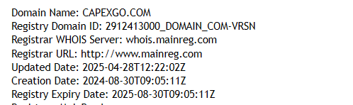 Moreover, CapexGo has not been around for long. The company doesn’t even mention its founding date. It’s treated like a secret. However, we can verify how long the platform has existed by checking the domain registration date. The official website, capexgo.com, was created on August 30, 2024. That’s less than a year ago. This broker is far too new.