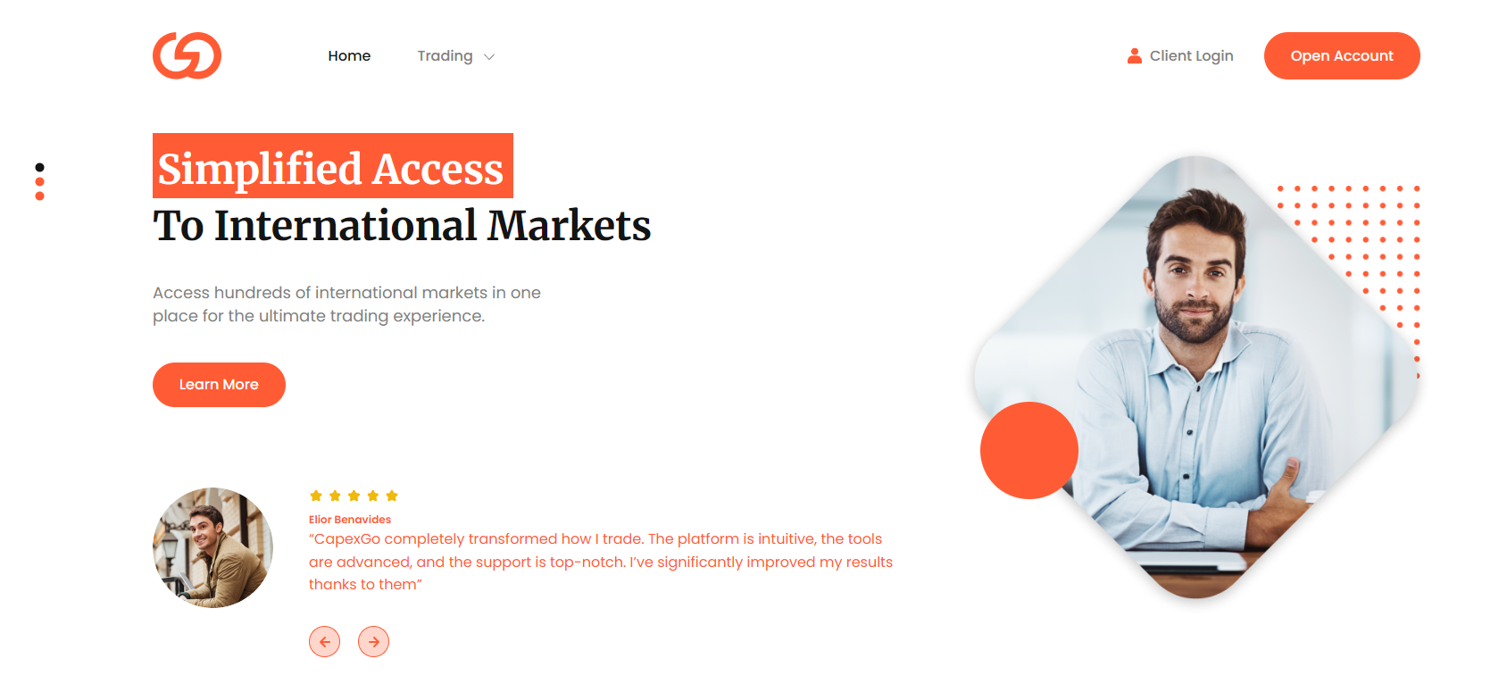 Every page features smiling men and women holding tablets, smartphones, laptops, or posing in front of charts — typical stock photos. Not a single real photo of the CapexGo team or their office. The homepage features a generic slogan: “Simplified access to international markets”. These pseudo-motivational phrases are everywhere on the site — a common trait of untrustworthy brokers.