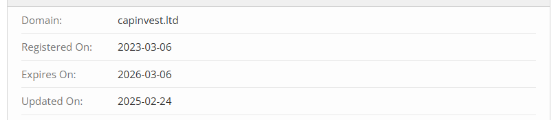 We can even check how long CAPINVEST LTD has been engaged in fraudulent activities. Their domain, capinvest.ltd, was registered only in February 2025. Moreover, they have only paid for it for one year, which means the platform does not plan to operate for long.