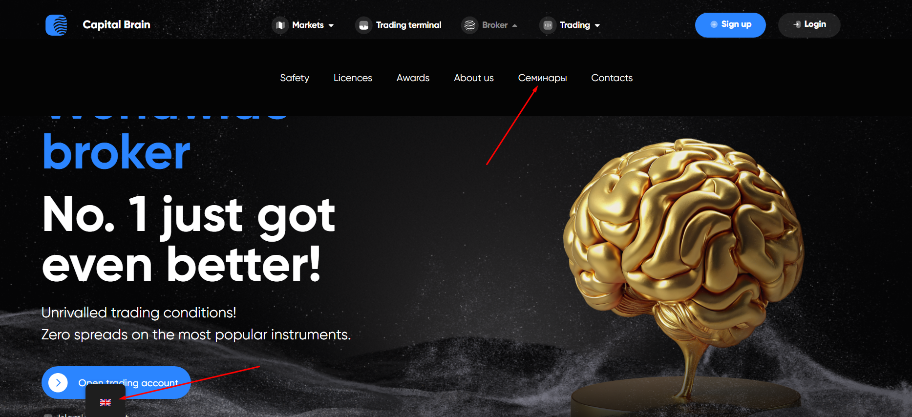 The official website looks standard and templated. The top part contains the main sections, the homepage is dominated by advertising blocks, and the footer has a risk warning and duplicates the top sections. The portal opens by default in Russian, although there is an English version. However, when switching to English, some elements remain in Russian, indicating the low quality of the site and the unprofessional approach of Capital Brain.