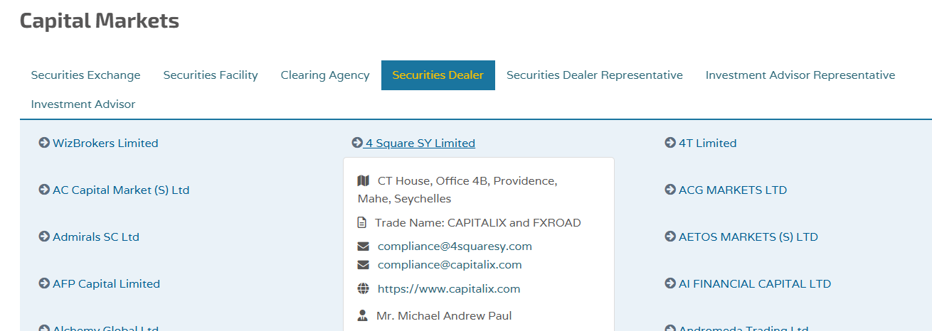 The platform is managed by 4Square SY Ltd, which is registered in the Seychelles. We checked the SFSA registry, and this organization has indeed received a license from the offshore regulator. However, this is no reason to assume the company is safe.