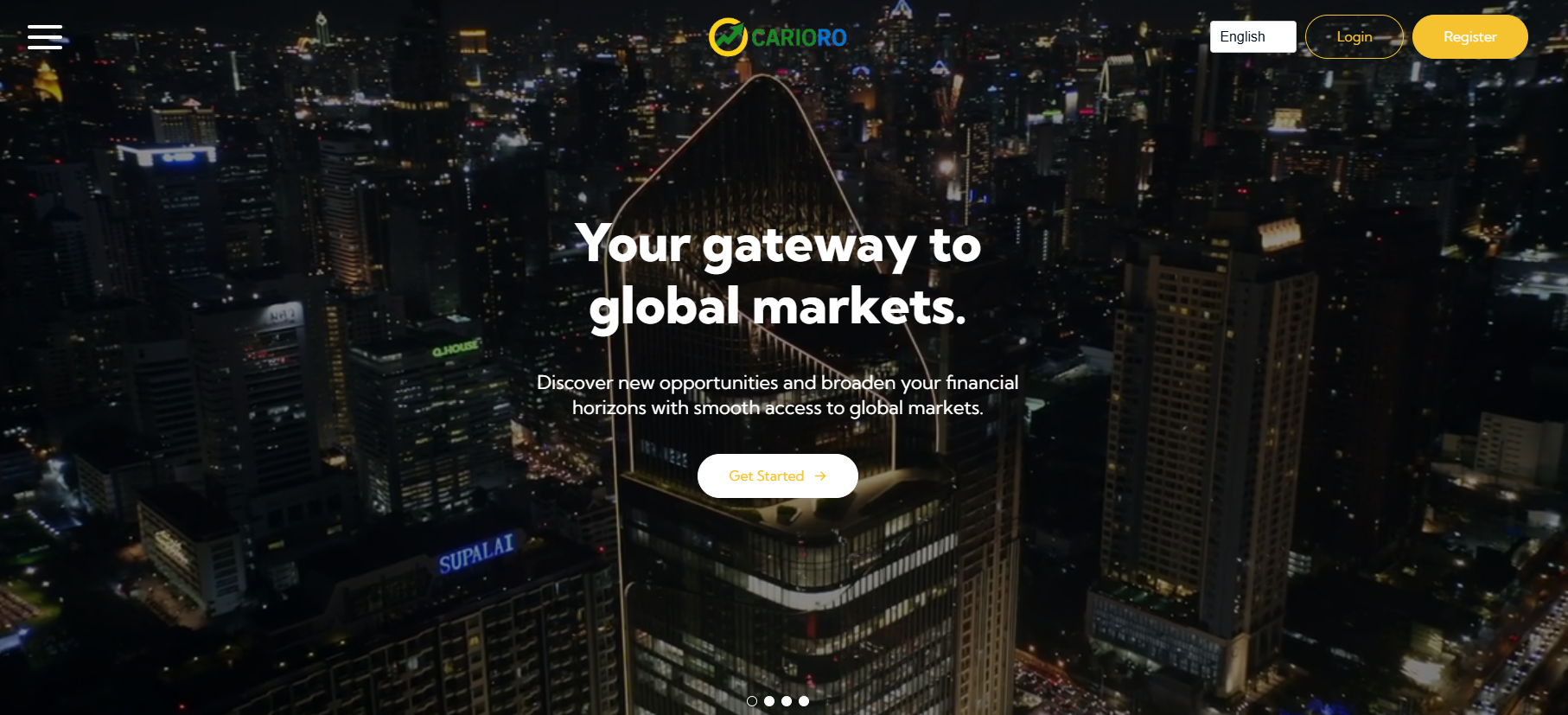 The Carioro website is a typical example of a templated fake broker that tries hard to appear as a serious international platform. Images of laptops, charts, and “trading” hands — we have seen all of this on dozens of similar fraudulent sites. The background video is a meaningless display of futurism with flashing lines, a night-time cityscape, and abstract graphics.