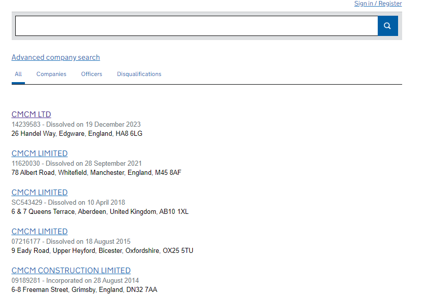 If the company’s headquarters are in the United Kingdom, then it should be registered in the legal registry and possess licenses from the English regulator, correct? Indeed. However, a check revealed that there is no such organization in either the legal registry (Companies House) or the financial commission (FCA). A search in the legal registry found many firms with similar names, but none of them are related to cmc-m.net.