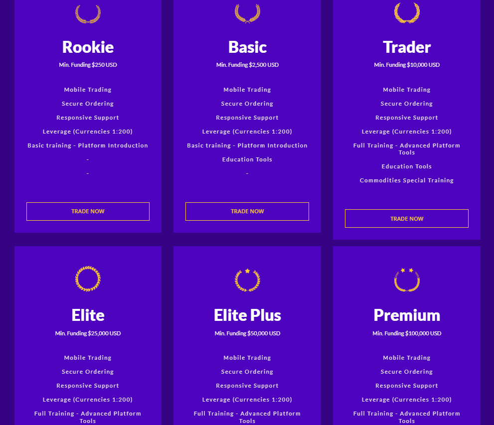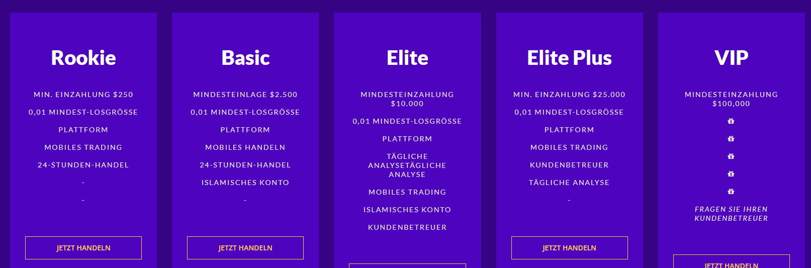 The minimum deposit is high — $250. At the same time, there is no cent account type, which allows clients without large sums to start trading with real money instead of a demo account. By the way, the demo account also seems to be absent. The size of the minimum deposit depends on the chosen account type. However, something interesting was found. If the official website is set to English, the user sees 8 types of accounts; if it is set to another language, like German or Russian, there are only 5. Is this a random error or something else?