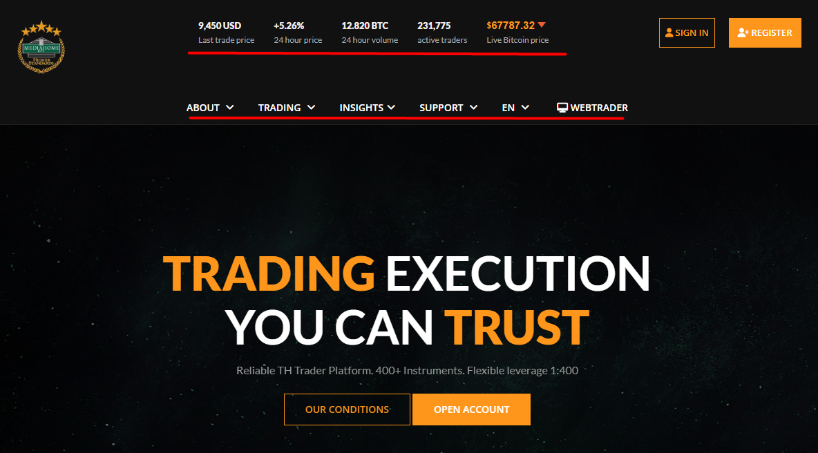 The design of the official website is not interesting, beautiful, or stylish. As usual, upon entering the site, you can see a moving menu with motivational phrases and the opportunities offered to clients. At the top, there is a panel with some statistics, where you can see that over 200,000 people are allegedly trading here, which seems like a lie. There is also the current price of Bitcoin, buttons for registration and login, and just below the main panel with sections about the broker’s activities, trading conditions, additional tools, and contacts.