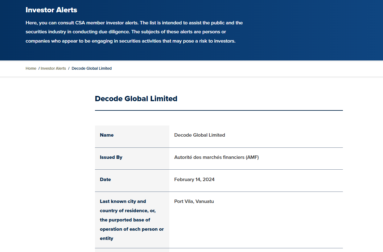It’s important to note that registration in offshore jurisdictions like Vanuatu often raises doubts about the level of regulatory oversight and investor protection. For example, the Autorité des marchés financiers (AMF), the Canadian financial regulator, issued a warning stating that Decode Global Limited is not registered and has no right to offer financial services in Quebec.