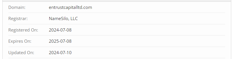 Judging by the domain entrustcapitalltd.com, the platform has been operating for a very short time. The domain was registered in July 2024, not in 2018. It is unlikely that an online broker could have operated for six years without a website. The firm not only lacks licenses and provides fabricated office addresses but has also existed for just a month.