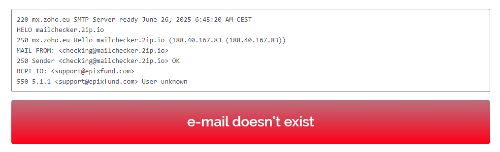 The most interesting part came during the verification of contact information. EpixFund lists two email addresses and a physical office address in the United Kingdom. It turns out the provided emails are fake. They do not exist, so writing to them is pointless.