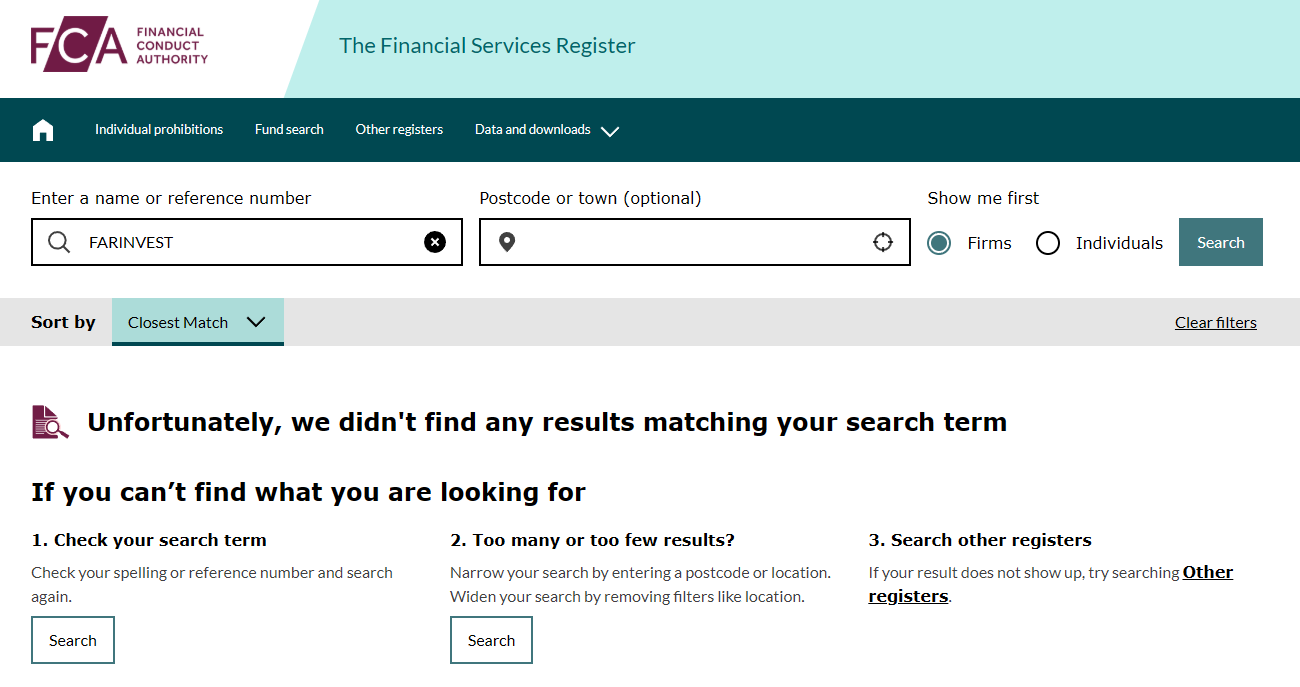 Now, let us examine the legal side of the company and what hides behind the loud claims of “regulation”. The broker lists two addresses: one in London and one in Dubai. However, verification shows that there is no such firm on the British regulator FCA’s registry. The DFSA database is also empty. Moreover, FarInvest LIMITED is missing from Companies House, the official registry of legal entities in the United Kingdom. This means the UK address is fake, used only for appearance and trust-building.