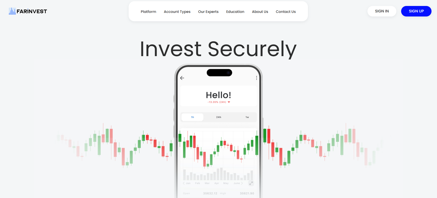 The official FarInvest website is built according to the classic template used by most other brokers. At the top of the page is the main menu: Platform, Account Types, Our Experts, Education, About Us, and Contact Us. On the right, there are buttons for logging into the personal account and for registration. The homepage greets visitors with loud slogans and “advantages” presented in block format: a universal trading platform, reliable infrastructure, 24/7 support, and training for traders of any level. In the footer, the site displays the company’s legal details, contact information, and regulator logos.