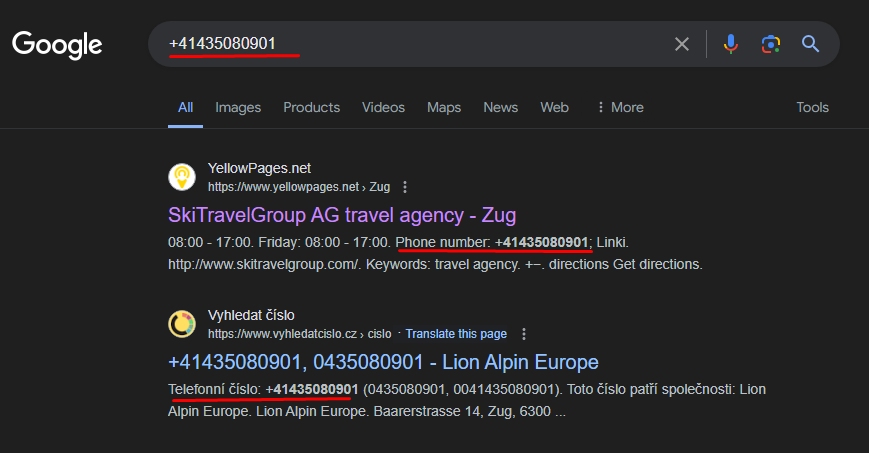 In addition to the special feedback form, Fast Refund Group has provided three phone numbers (USA, Australia, Switzerland) and an email address. The phone number from the USA has seven complaints and is marked with a low trust rating. The Australian number has no information, but the Swiss number is very interesting. When attempting to search +41435080901 on Google, it shows that it belongs to two other organizations that have no relation to the chargeback industry.