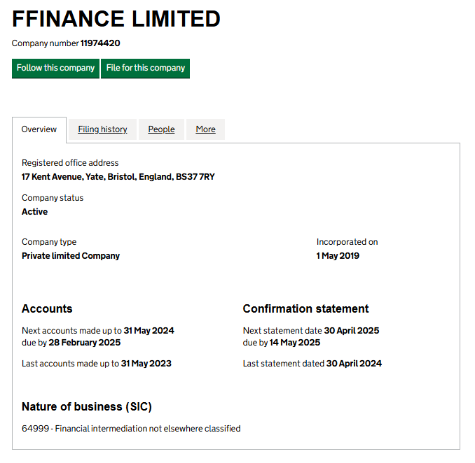 Let’s check the UK registries to determine if this company exists. First, the FCA registry shows no record of this company, confirming its illegal operations. Second, in the Companies House registry, we found a company named FFINANCE LIMITED, but it’s a different organization unrelated to fillfinance.com. Why? Because it has a different founding date — 2019, while our subject boasts about operating since 2010. Its name is also different: FFINANCE, not Fill Finance. Additionally, we managed to find a possible phone number for FFINANCE — 07921 189520 — which is clearly different from the one listed by the forex broker.