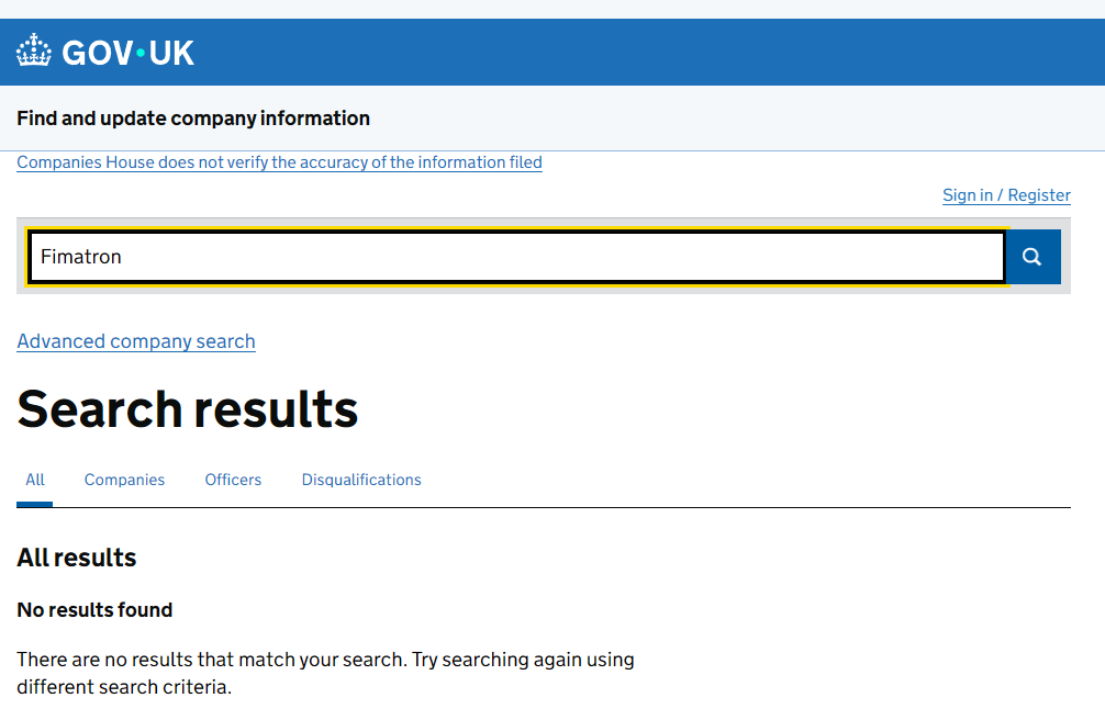 Fimatron actively uses a UK address and UK phone numbers, creating the appearance of a British company. However, a check through Companies House produces a clear result: no organization with this name exists on the UK register. Neither active, nor dissolved, nor even in the process of registration. This means that we are dealing not just with an unregulated broker, but with a project that is not registered as a legal entity in the United Kingdom at all, despite all the claims and the deliberately “British” visual presentation.
