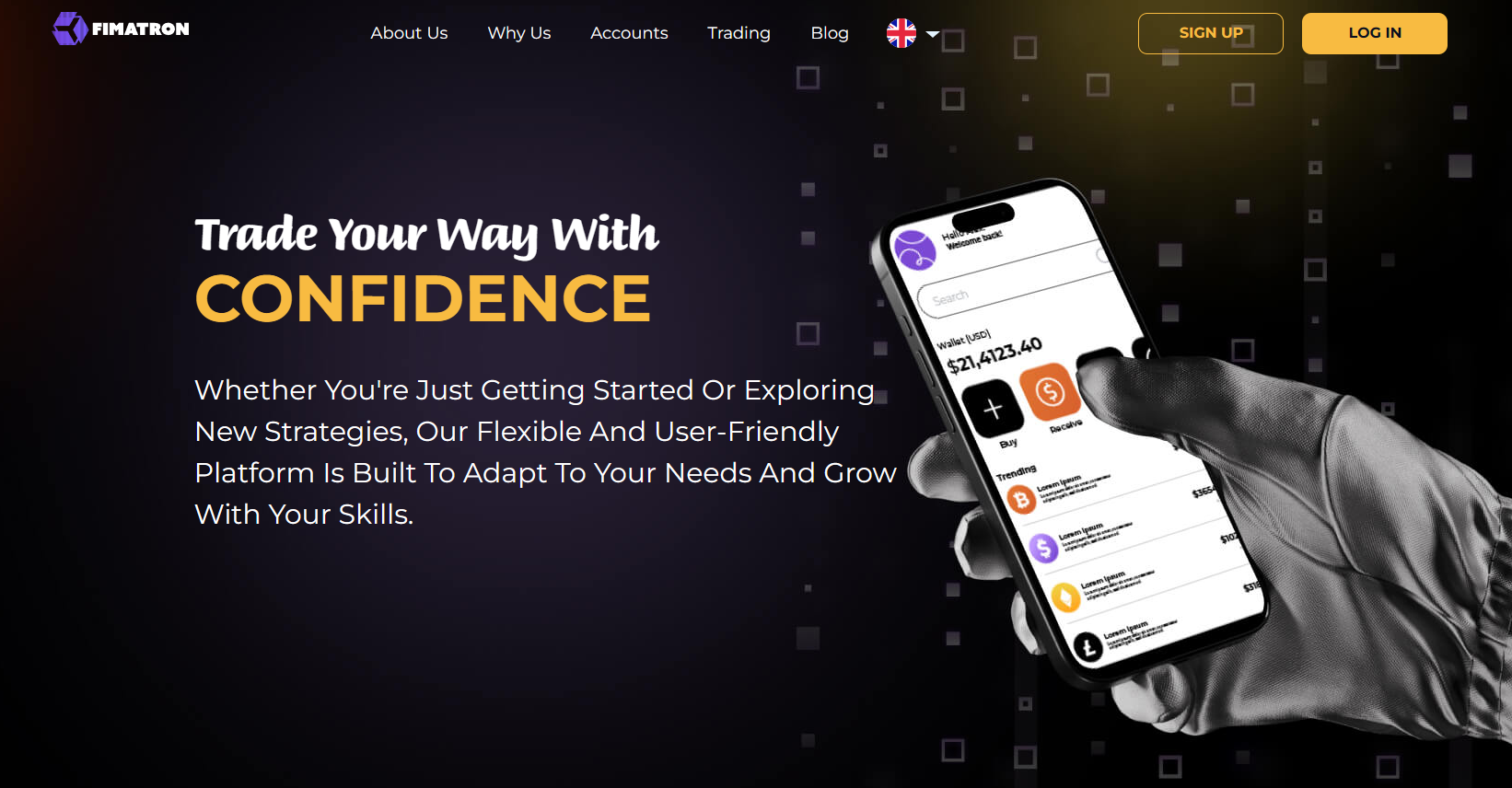 The official Fimatron website is designed to attract the attention of inexperienced traders rather than function as a standard brokerage resource. The homepage opens with a large banner featuring a slogan about confident trading and an image of a user with a mobile application displayed on the screen. The header contains a standard set of elements: a menu with sections such as About Us, Why Us, Accounts, Trading, Blog, a language switcher, and Sign Up / Log In buttons. The color palette is bright — a black background combined with purple and gold elements, large headlines, and visuals featuring portfolios and charts that create the impression of a modern fintech platform.