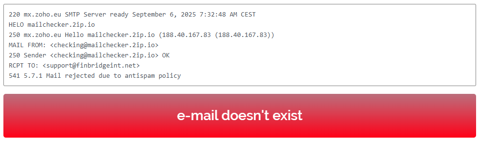 Any serious brokerage company strives to be as accessible as possible to its clients. So what do we see at FinBridge International? Just one contact option — an email. And even that comes with a catch: verification showed that this address does not exist. In other words, it is impossible to reach the company’s representatives at all. It is not a working mailbox but simply a line on the site created “for show”.