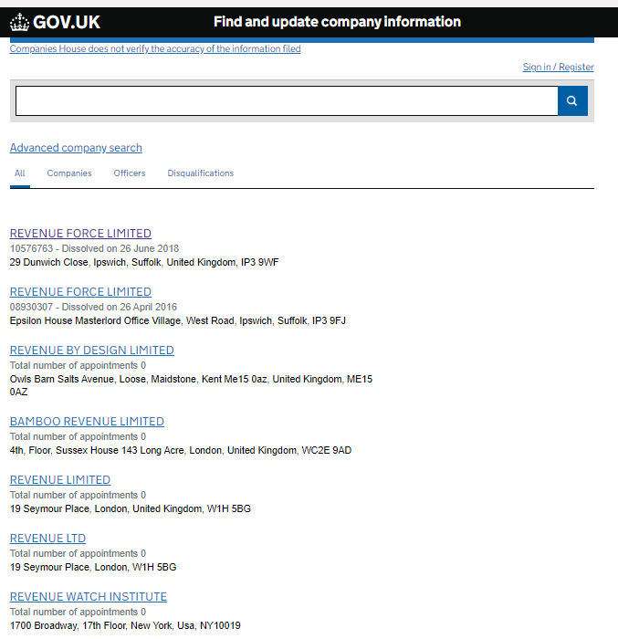 We turn to the Companies House registry, which contains information on all legal entities registered in the UK. There are many companies with similar names, but none of them are connected to the forcerevenu.com website.