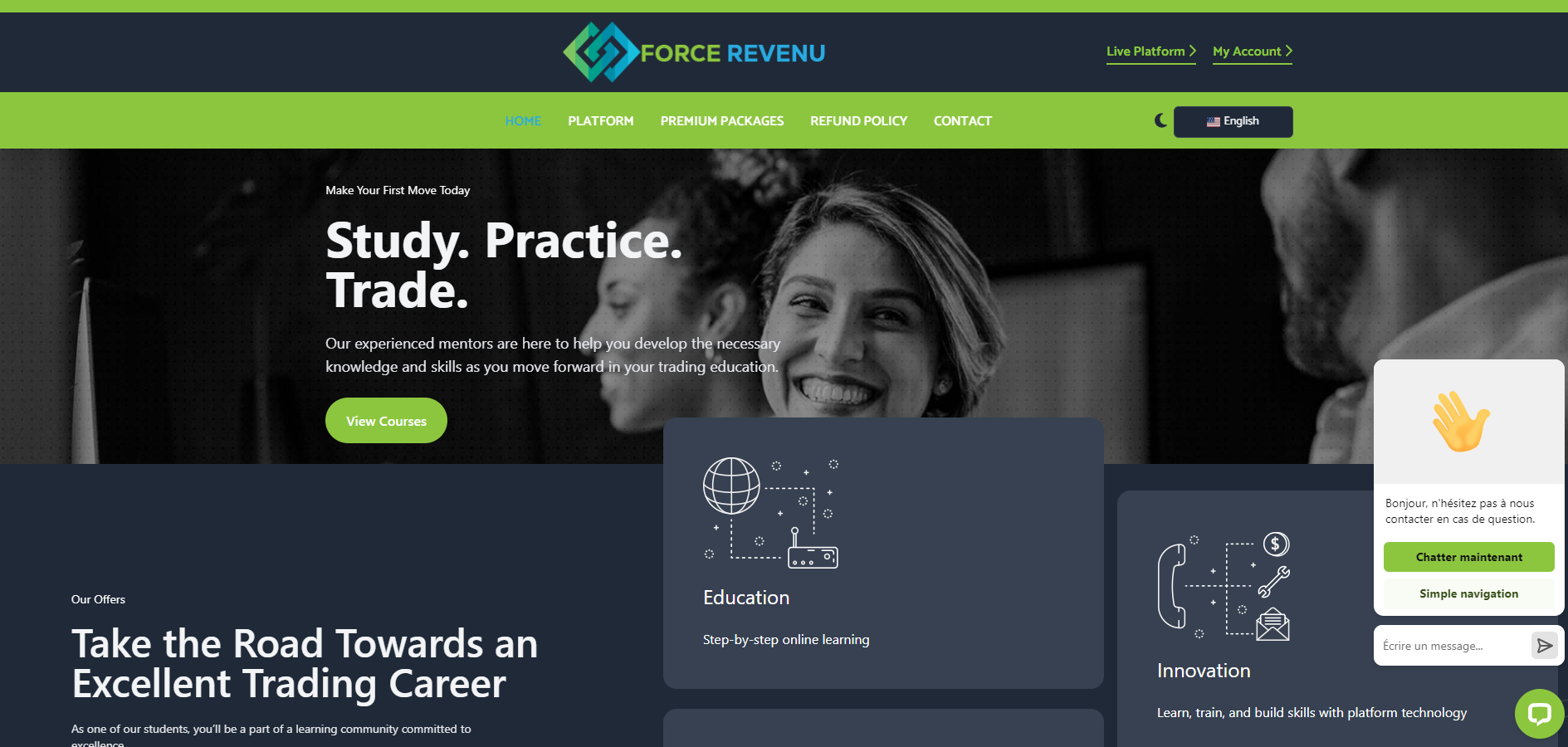 The site supports two languages: English and French. Since the online chat greets visitors in French, it can be assumed that the company targets French citizens. The site’s design is very basic — nothing sophisticated or unique. It’s all about listing fake advantages, describing packages, fabricated statistics, and legal documents. Creating such a site is not difficult and doesn’t take much time, so you shouldn’t expect a serious and professional approach from Force Revenu.