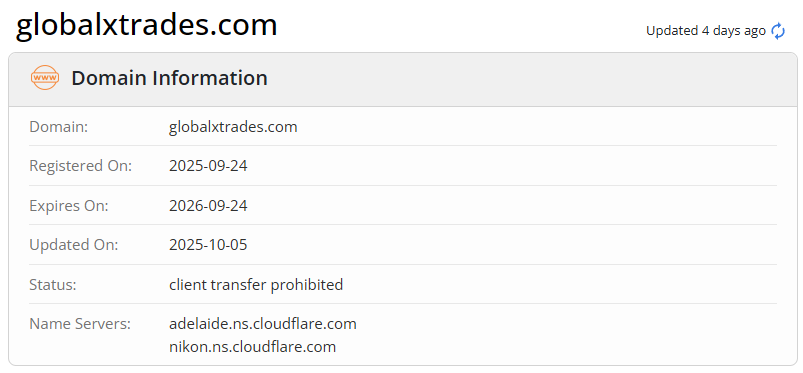 Now we check how long Global X Trades has been around. The website provides no information about when the company began operating. No founding year, no history, no development milestones — nothing. A Whois lookup shows that the domain was registered on September 24, 2025. In other words, the platform appeared very recently.
