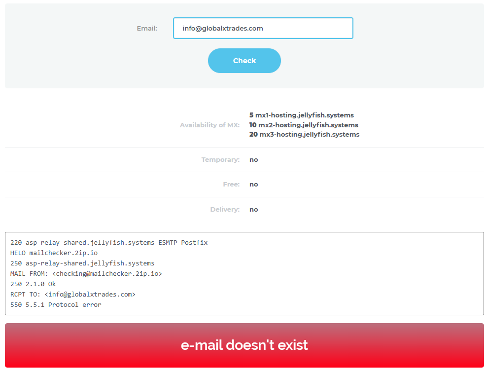 However, the biggest red flag is the fake email address. The broker lists a contact email that doesn’t exist. You won’t be able to reach technical support or get a reply — it’s completely fake.
