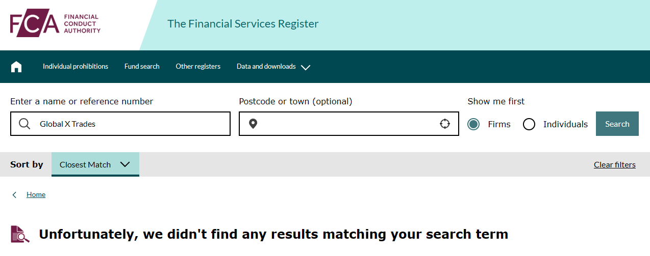 Let’s start with licensing. The company lists a UK address, which means it must appear in the FCA registry — the official financial regulator of the United Kingdom. We open the FCA database, enter Global X Trades, and see zero results. The regulator has never heard of this company. Legitimate UK brokers have a license number, a link to their FCA profile, and complete transparency. Here, none of that exists at all.