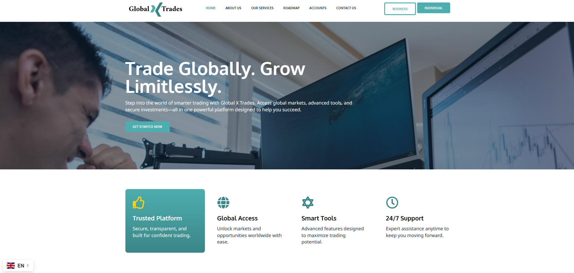 The official Global X Trades website looks like a typical, hastily assembled template project. The design appears neat but far too sterile and impersonal — as if you’re looking at yet another prefab site where only the logo and a few headlines were changed. The homepage features stock photos: a man stressed over a chart, random candlestick screens, and laptops in living rooms. These images have nothing to do with real trading. They’re just generic visuals “for mood”, easily downloadable from free image libraries.