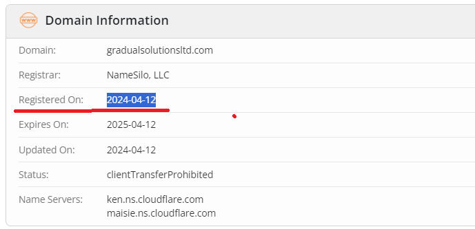 Another confirmation is the information about its existence. According to the Whois service, the domain gradualsolutionsltd.com was registered only on April 12, 2024.