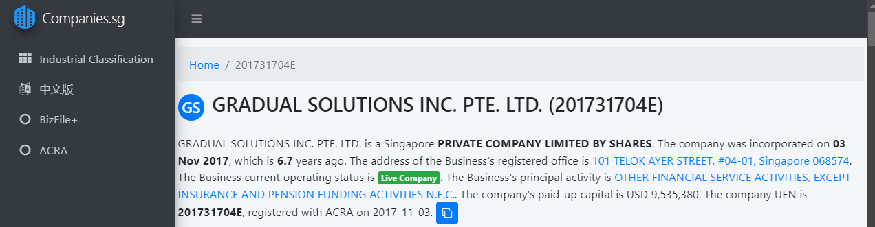 The real GRADUAL SOLUTIONS INC. PTE. LTD. was registered in November 2017 under number 201731704E, providing other financial services, excluding insurance and pension fund activities, with a capital of more than 9.5 million USD.
