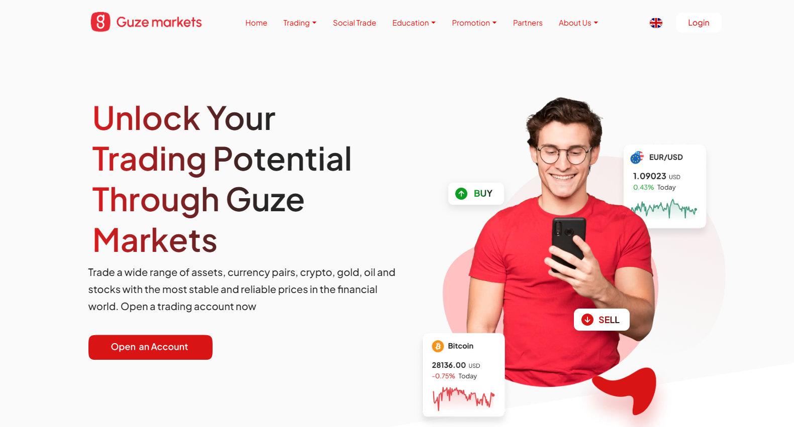As usual, let us start with the official website of Guze Markets. The broker has developed a site in white and red tones with a standard layout: the top section features the main menu (conditions, education, promotions, partnership program, and information about the broker), while the footer includes a risk warning about margin CFD trading and a list of restricted countries.