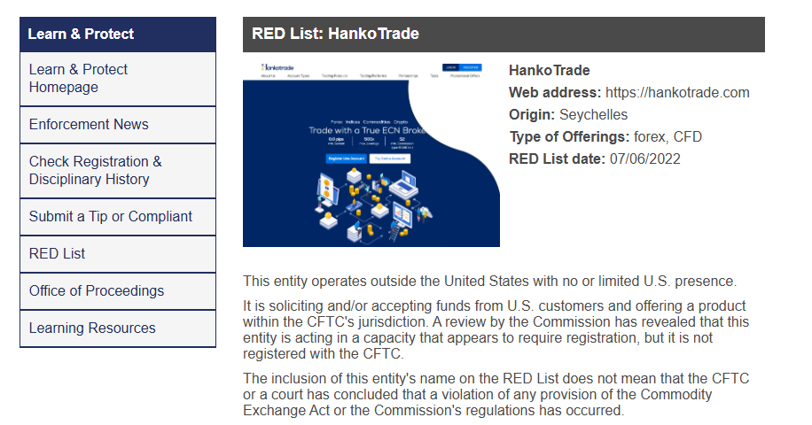 One more interesting and important point. The U.S. Commodity Futures Trading Commission (CFTC) has added Hankotrade to its RED List, indicating that the company is operating without the required registration and may pose a risk to investors. Here is the link to that entry from the CFTC: https://www.cftc.gov/node/241186.