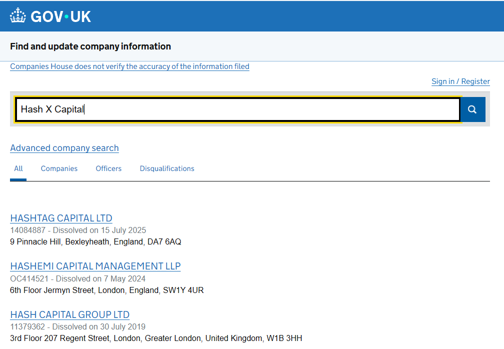 We checked the FCA and Companies House registers — and the result was clear: no such company exists. Hash X Capital is not listed among licensed brokers or officially registered entities.