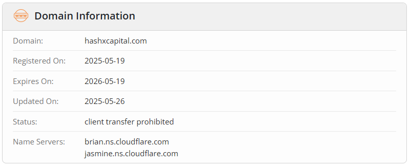 The domain hashxcapital.com was registered only on May 19, 2025, which completely disproves the myth of “many years of experience” and “tens of thousands of clients”. The young age of the website is a key indicator that the company appeared recently and has no proven reputation. This is yet another major red flag.